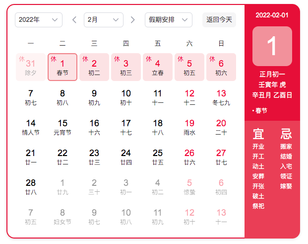 1月28日(星期五,腊月二十六) 至2月6日(星期日,初六)放假调休,共9天。